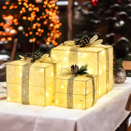 Large TISEJOY Christmas Lighted Gift Boxes 10",Set of 3 Pre-lit 60 LED Warm White Tinsel ...