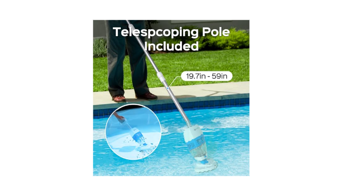 Telescopic Pole for Easy Cleaning : This small pool vacuum features a telescoping pole that rotates and connects the sections and starts to clean, allowing for easy pool cleaning.With a minimum length of 19.7 inches and a maximum length of 59 inches. You can easily pull up grit and sand for easier pool cleaning.