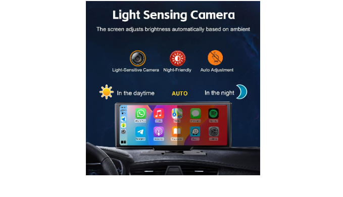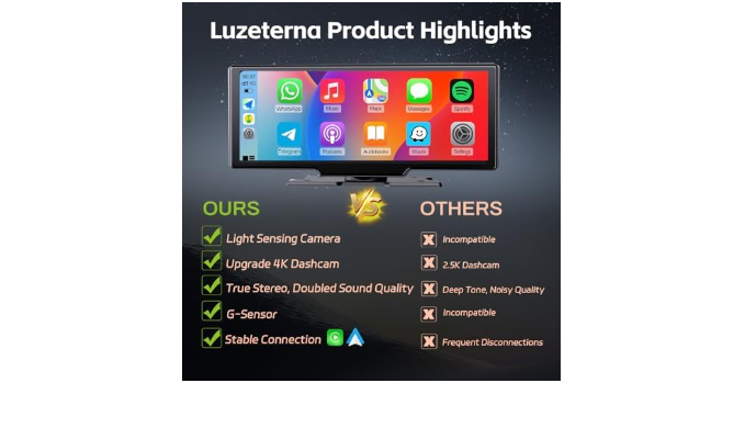 【Automatic Brightness Adjustment】The Luzeterna portable apple carplay eatures intelligent automatic brightness adjustment based on day and night conditions to avoid dazzling glare. You don’t need to manually adjust it, ensuring more comfort and safety when driving at night.