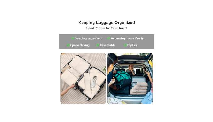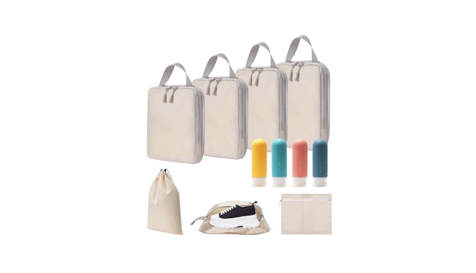 11 SET TRAVEL ESSENTIALS:Include 7 set Compression Packing Cubes and 4 set TSA Approved travel bottles.The Packing Cubes for Travel include 4 different size of compression cubes,1 Shoe Bag,1 Cable Organizer and 1 Laundry Bag, can pack 14 days clothes,fully meet your packing demands.