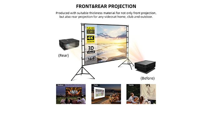 Excellent Projection Display: This 150 inch Movie Projector Screen with Stand, 16:9 Aspect Ratio, and 160 Degrees wide Viewing Angle. The Portable Projector Screen will Become your Projector and your Best friend. The Movie Projector Screen is Designed to Provide Clear, High-resolution images, Rich colors, and an excellent viewing experience in different viewing positions.