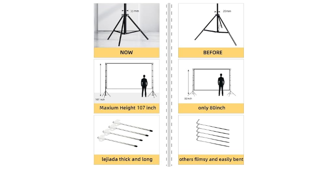 High-quality Accessories: The telescopic design of the Projector Screen with Stand bracket is made of high-quality steel pipes, and the surface is rust-proof paint, so there is no need to worry about rust and bending. The buckle structure is matched with the eye nuts to make the overall support more stable. The triangular structure and the attached fixed accessories further enhance the user experience.