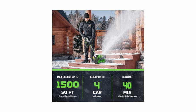 Brushless Motor Power – Clears up to 5 Car Driveways. This Brushless cordless snow blower is equipped with a high-efficiency brushless motor, featuring long running time and low vibration, which effectively extends the motor\\\'s service life. Meanwhile, it can clear snow from 5 driveways in one go, meeting the demand for efficient snow removal.