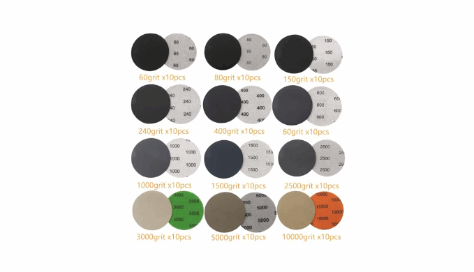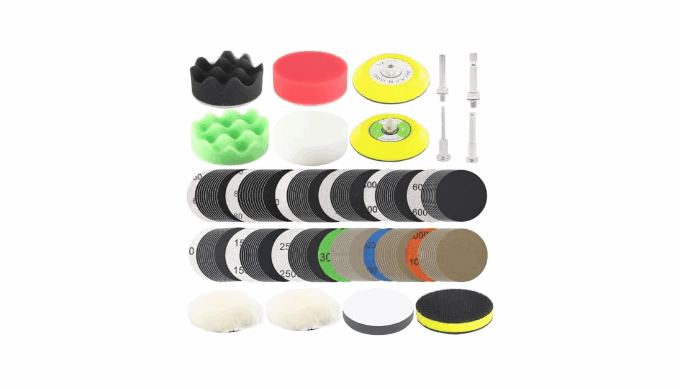 All In sanding kit - Drill polishing kit Included total 144pcs, 120pcs 3inch sandpapers assortment from 60 to 10000 grit, each 10pcs, 60/80/150/240/400/600/1000/1500/2500/3000/5000/10000. 1pcs 3inch backing pad with 1/4 and 1/8 inch shank, 1pcs 3inch Backer Pads with 1/4” round and hex shanks, 1pcs 3inch High Foam Interface Pad and 1pcs Soft Foam Interface Pad,2pcs 3Inch Wool Pad,2pcs Flat Sponge, 2pcs Wave Sponge.