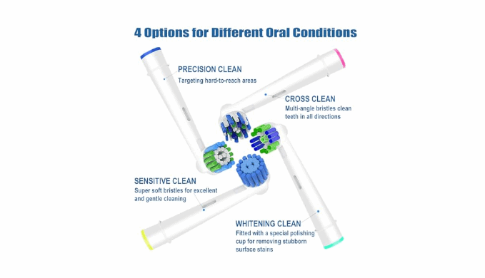 4pcs CROSS CLEAN - These Cross brush heads are set at unique cross angle bristles to reach deep between teeth, features specifically engineered bristles that are designed for optimal tooth coverage, keep your mouth feels cleaner, deliver a thorough, comfortable brushing experience.