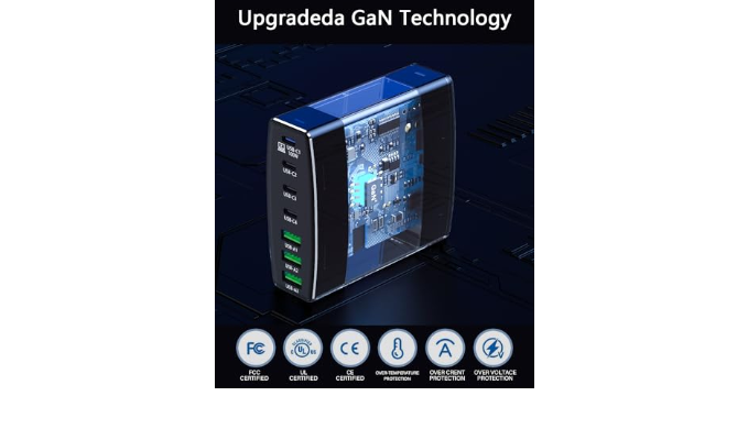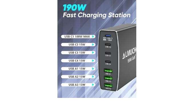 【Safe & Fast Charging】This 190W GaN Charging Station is powered by the industry-leading GaN3 technology, which makes it smaller in size, generate more efficient charging power, produce less heat. It has a powerful safety protection system, which can prevent over-charging, over-voltage, over-current, and over-heating to ensure the safety of your devices. Our 7-ports desktop charger support PD3.0/PPS/QC5/QC3.0/SCP/AFC/DCP/FCP fast charging protocols, USB C1 Port for up to 100W of power, support 5A Max current, this usb c charger can charge MacBook Air from 0-50% in just 30 minutes.