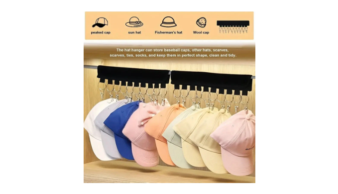 - Carry it with you and hang it on an ordinary hanger. Then clamp the hat on the stainless steel clamp. Your hanger will instantly become a baseball cap storage rack or hat rack. Suitable for most hat types such as baseball caps, cowboy hats, bucket hats, peaked caps, sun hats and other hats. Foldable, light weight, suitable for travel. Can also store other items accessories.