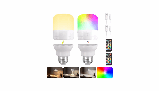 【Detachable Magnetic Base & Wireless Freedom】The strong magnetic base turns any E26 socket into a charging dock and tool-free mounting point . No wiring or electrician needed—easily attach it to metal surfaces like closets, garages, or under cabinets. Perfect for \\\"no-power\\\" zones: use it as wireless wall sconces, closet lights, or outdoor camping lamps. In power outages, simply detach it to use as a portable flashlight for safe navigation . Its compact size (60*105mm) and 140g weight make it easy to carry for hiking, barn work, or garage repairs