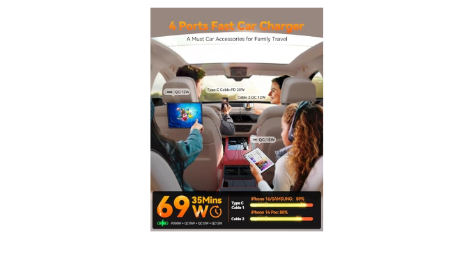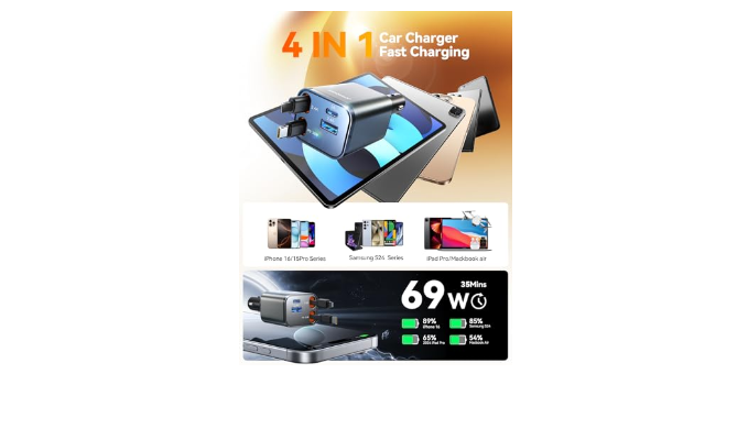 Ⅱ: Versatile and Powerful 4 Ports Car Charger - JOYROOM 69W Retractable car charger 4 in 1 with USB-C and USB [QC15W+QC12W] ports and 2 multi-functional retractable cables (PD30W+12W) for charging up to 4 devices at the same time. Whether you\\\'re looking for car accessories for men or women, that‘s a nice choice. Makes your car more neat and organized with this smart car organization solution. Smart car charger usb c efficient power distribution ensures full speed charge all your devices without slowing down the charging speed