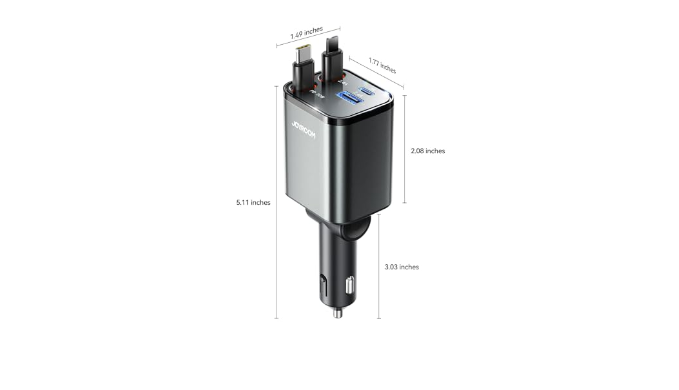 Ⅰ: First Compact and Car Organization Charging Solution - JOYROOM 2025 New Upgrade Smallest 4 in 1 Retractable Car Charger, measuring 5.11 x 1.77 x 1.49 inches, solves the risk of other bulkly retractable car charger affecting driving and more perfectly fits car cigarette lighter. It supports 180° rotation, and features 2 multi-functional retractable cords extending up to 31.5 inches (80CM). As one of the must-have car accessories essentials for family travel, its compact design saves space, making it perfect for tight areas like trucks, old vehicles. It\\\'s ideal for iPhone and Android users, including iPhone 16 Car Charger USB C as well as USB port and USB-C devices users