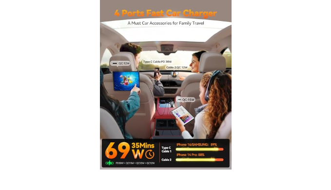 Ⅱ: Versatile and Powerful 4 Ports Car Charger - JOYROOM 69W Retractable car charger 4 in 1 with USB-C and USB [QC15W+QC12W] ports and 2 multi-functional retractable cables (PD30W+12W) for charging up to 4 devices at the same time. Whether you\\\'re looking for car accessories for men or women, that‘s a nice choice. Makes your car more neat and organized with this smart car organization solution. Smart car charger usb c efficient power distribution ensures full speed charge all your devices without slowing down the charging speed