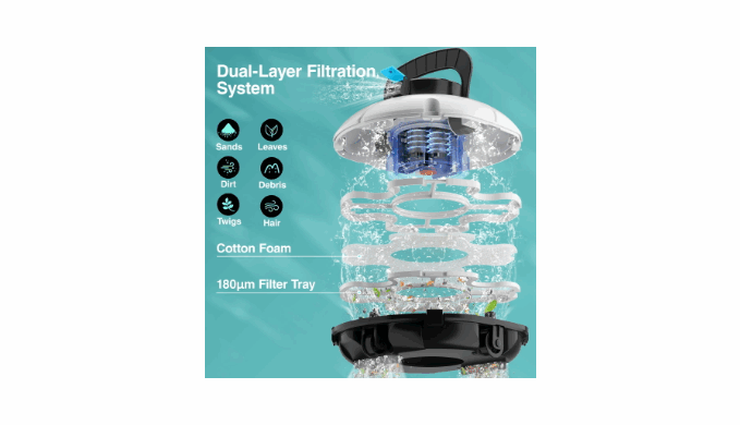 Winny 1102P cordless robotic pool cleaner is a better choice to make your pool sparkle again. With a dual-layer filtration system and upgrade dual motors, it has a superior cleaning performance, effectively removes debris, sand, leaves and more, providing a cleaner pool. The 3200mAh battery offers a solid cleaning time up to 80 minutes with a quick 3-4 hour charge. The pool vacuum is suitable for various of above/in-ground pools up to 645 square feet with a flat bottom (max slope < 15°). It automatically returns to the shore when the battery is low or the task is complete. The device weighs only 7.27lb, making it easy to remove from pool and easy to store. Winny 1102P is efficient and convenient , making your summer pool life easier.