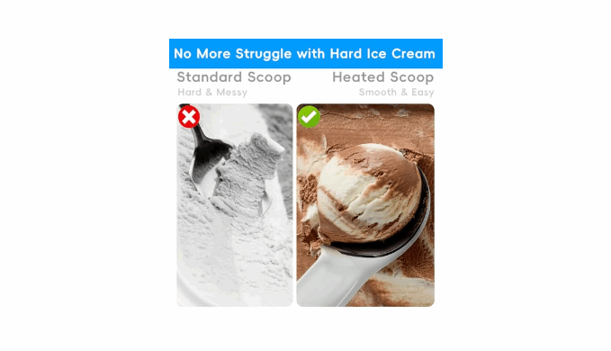 Effortless Scooping with Heating Technology: Say goodbye to hard ice cream! Our heated ice cream scoop uses a built-in heating chip and high-efficiency thermal plate to warm the scoop head up to 158°F, making it easy to create smooth, round scoops even with frozen-solid ice cream.