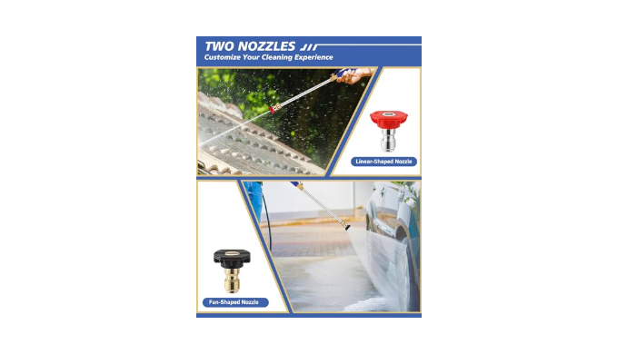 【Exquisite Design】Our high pressure hose nozzle features a straight gun barrel design for enhanced stability and precision during operation.Featuring two interchangeable jet nozzles(Fan-shaped nozzle and Linear nozzle). Using a power washer with a fan-shaped nozzle allows for a large spray of water, while the jet nozzle has a stronger impact.Whether you need to wash your car, clean your windows or patio, or water your garden, you can switch nozzles at will, adjusting the water pressure and flow to suit your needs