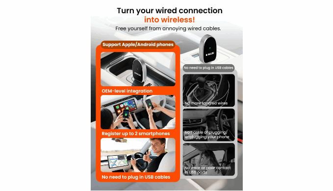 - 【Maps to Music — All Wireless】Say goodbye to tangled charging cables cluttering your center console. This carplay/andorid auto wireless adapter gives you instant wireless access to your go-to navigation apps, playlists, calls, and voice assistants. Whether you’re commuting to work, heading out for a weekend trip, or taking a scenic drive, your car gadget keeps your ride sleek and connected.
