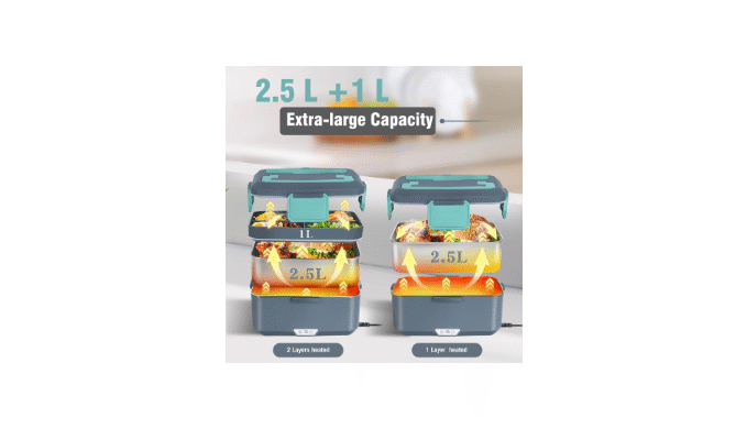 2.5L+1L SUPER LARGE CAPACITY DESIGN :The electric lunch box food heater designs 2.5L 304 stainless steel container+ 1 Liter fruit tray super large capacity meets your hearty dietary needs and is suitable for people who have requirements for appetite, such as male drivers, workers and office workers.No need to worry about the combination of food, you can freely match your favorite ingredients and enjoy a hot meal.