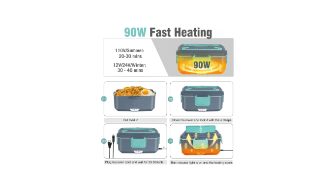 90 W FAST HEATING LONCHERAS PARA HOMBRES DE TRABAJO: The electric lunch box for men heats up quickly with a power of up to 90 W.PTC constant temperature heating technology is more uniform and safer than traditional resistance wire heating. Whether you are on a business trip and have lunch in the car, have a quick meal during lunch break, or have lunch in the office, this heated lunch box can let you eat a rich hot meal instead of a cold and tasteless sandwich or salad, so that you can enjoy warm food like home anytime, anywhere.