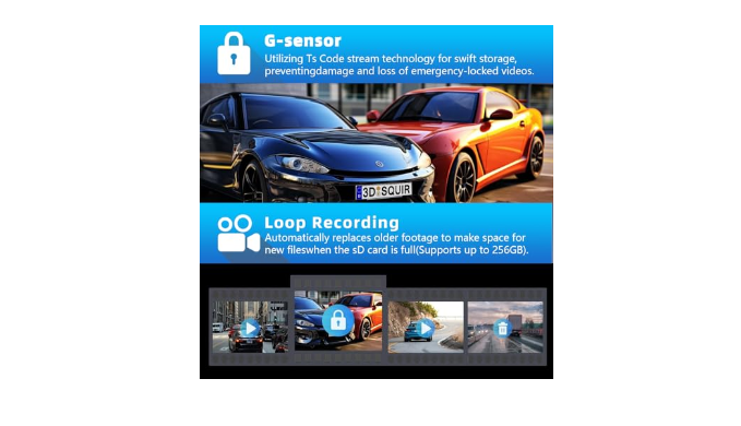 【Built in G-sensor & Loop Recording】This triple dash cam front and inside can automatically overwrite the oldest videos with the latest videos even if the insert memory card reaches its max storage to achieve seamless loop recording;The Built in G-sensor can lock and save important footage when collision happens during driving and parking and will not be overwritten.