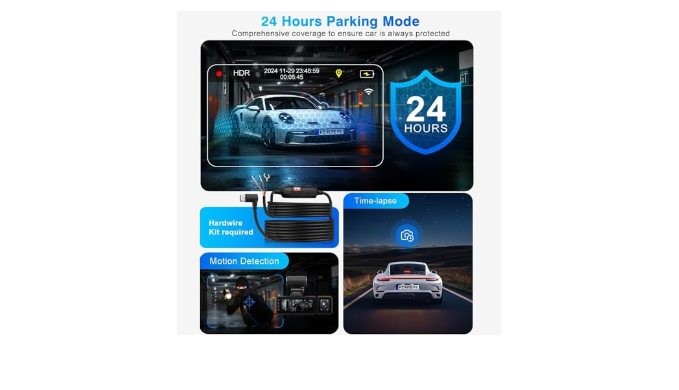 【24 Hours Parking Guard】The parking monitor of the car dash cam front and back will be automatically activated to records emergency videos upon detecting collisions, providing evidence in case of theft or accidents while parked.To achieve this parking mode function, an extra car accessory- ACC hardwire kit is required (not included in the package), the Time-Lapse Recording keeps recording continuously with low power consumption and low frame rate. Provides 24 hours protection to you cars.
