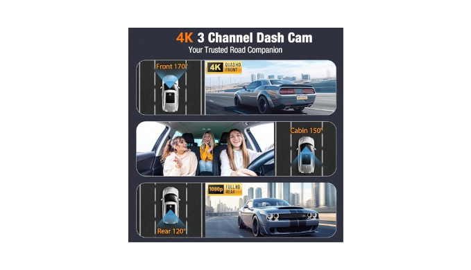 【HD 3-Channel WiFi Dash Cam】The dash cam monitors your car’s front and rear, and inside in 4K+1080P+1080P resolution, providing all-around surveillance and ensuring high-definition coverage from every angle. Whether it\'s day or night, the dash cam helps you feel secure on the road with continuous, high-quality video recording.