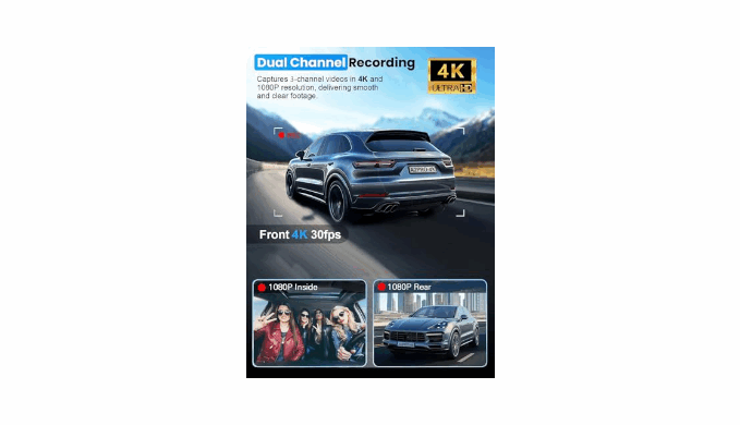 【3-Channel WiFi Dash Cam with Front, Rear & Interior Views】Capture every angle with triple-camera clarity: 4K UHD front recording (170° ultra-wide lens), 1080P interior monitoring (150° cabin view), and 1080P rear coverage (120° rear lens). Eliminate blind spots while crisply documenting license plates, road signs, and cabin activity day or night. Enhanced low-light performance ensures critical details stay visible for complete driving confidence.