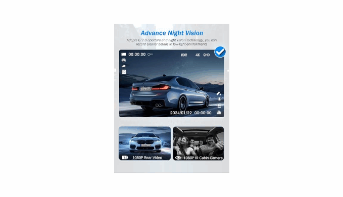 【Night Vision Clarity & Parking Surveillance】WDR technology balances light extremes for crisp nighttime footage, while interior IR LEDs illuminate cabin details. Parking Guard activates upon vehicle impact/vibration (requires optional hardwiring kit for 24/7 monitoring). Never miss critical events – even when parked.