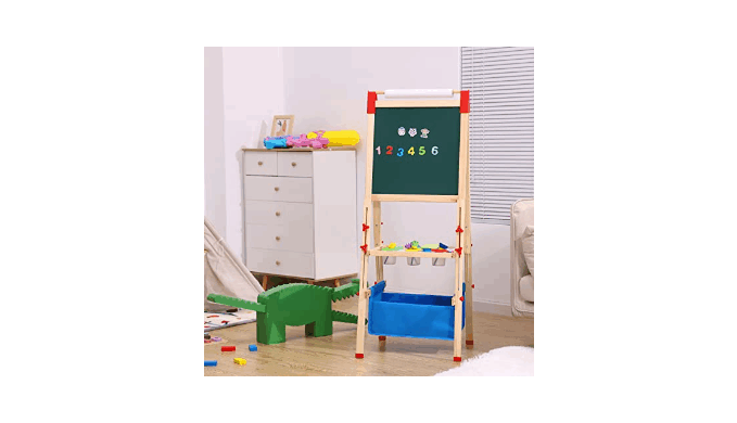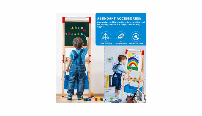 100+PCS ACCESSORIES: our art easel using pine wood and PP materials, sturdiness and durability. Come with multi accessories: apron, painting brushes & pots, magnetic Nos., letters & animals., dust free chalk & markers, eraser and rule. An extra-large tray and canvas bag for convenient storage.