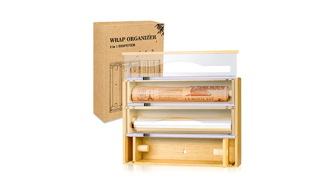 【3 IN 1 UNIQUE DESIGN 】The Wrap Dispenser with cutter adopt 3 in1 designs, and every wrap dispenser was designed 2 short wooden cylinder stopper with 2 small wood chip card board on both end, and there are 2 groove on each end of Wrap Dispenser, which make the plastic warp, foil can be stuck tightly in the wrap dispenser. Beside each dispenser equips with separate transparent acrylic lids which help you clearly see the usage amount of plastic warp, and change it timely.