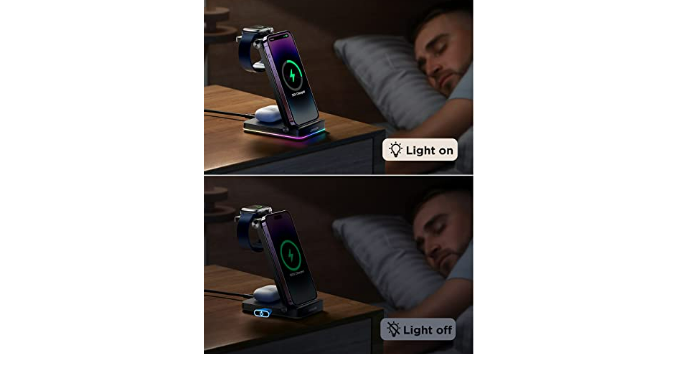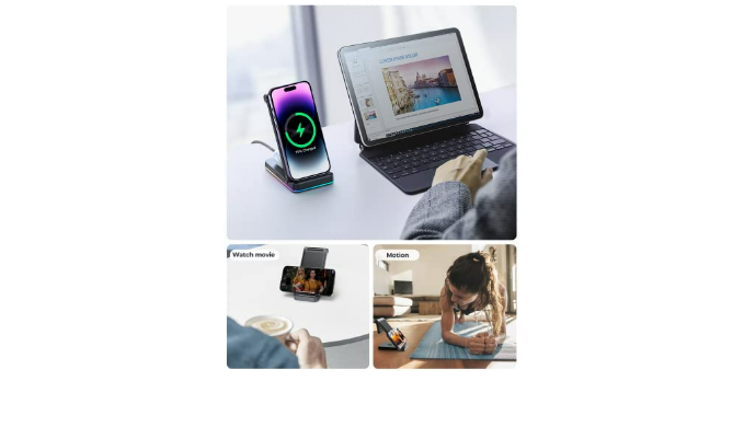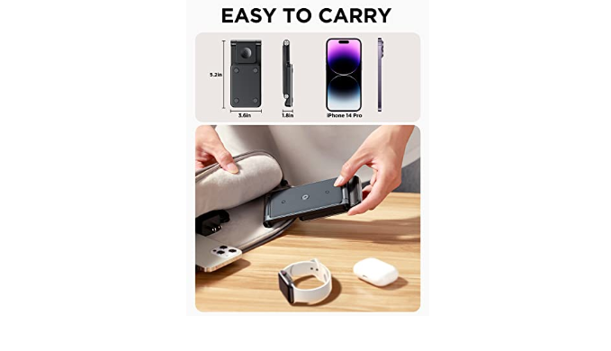 [Foldable and Compact Design] The phone charging station can be folded into a mobile phone size for easy portability, and the slim design of only 0.6lb weight makes it easy to fit into a backpack or luggage. In the past, you\'d have to unplug all your home chargers and carry an entire charging station and multiple cords before traveling, but this 3-in-1 charger can eliminate all that for you. One plug and done!