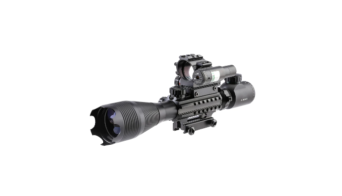 Four in one 4-16x50EG riflescope system provides incredibly good value. Our premium riflescope features unsurpassed light transmission, uncompromising mechanical performance, and unbeatable optical clarity. The matching green laser sight helps you to aim better and the red/green dot sight equips you with better vision even in the darkest environment. Magnification is from 4 times up to 16 times. Green and red illuminations with 5 brightness adjustments for the riflescope guarantee clear visions; 4 reticle patterns for you to choose from for the red/green dot sight along with unlimited brightness control. The 45-degree offset angle rail mount makes it easy for you to attach other attachments to it. Waterproof and fog proof, it also comes with lens covers. Take our riflescope with you on your next hunting trip!