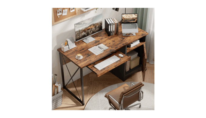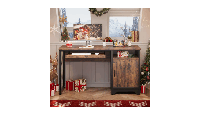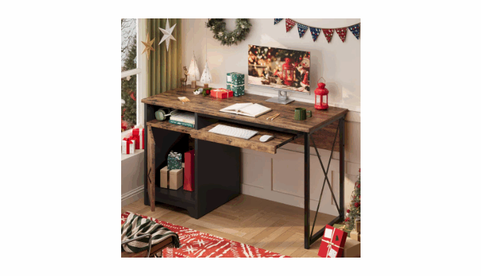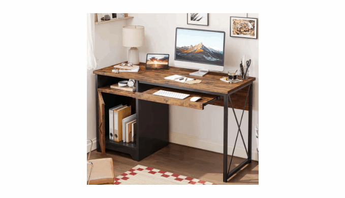 Maximize your workspace with this versatile 47-inch vintage industry office desk. Perfect as a home office desk or computer desk, its smart reversible design allows it to fit perfectly in any corner, making it an ideal corner desk. Featrures with a flexible Pull-out Keyboard tray and a built-in storage cabinet and open shelf offer ample space for organizers and accessories. The robust X-frame support ensures stability, safely handling up to 150 lbs on the desktop. This desk with storage combines a sleek profile with practical function, providing a compact, sturdy, and organized solution for all your tasks.