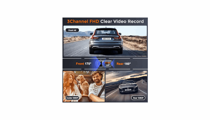 【3 Channel Recording Dash Cam】The dash cam monitors your car’s front, inside and rear in 4K+1080P+1080P resolution, providing all-around surveillance and ensuring high-definition coverage from every angle. With a 170° front view, 165° cabin view, and 160° rear view, the triple dashcam ensures you never miss a moment and stay protected with 360° full-protection, perfect choice for daily drivers and family trips, giving you greater peace of mind during your journey.