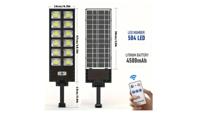 This solar street light boasts 504 ultra-bright LED lights for maximum brightness. The wide angle motion sensor detects movement from a distance and the remote control allows for easy adjustments. With its energy-efficient design, it automatically turns on at dusk and off at dawn for added convenience. Plus, it\'s waterproof and adjustable for all weather conditions. Keep your surroundings safe and well-lit with this reliable solar street light.
