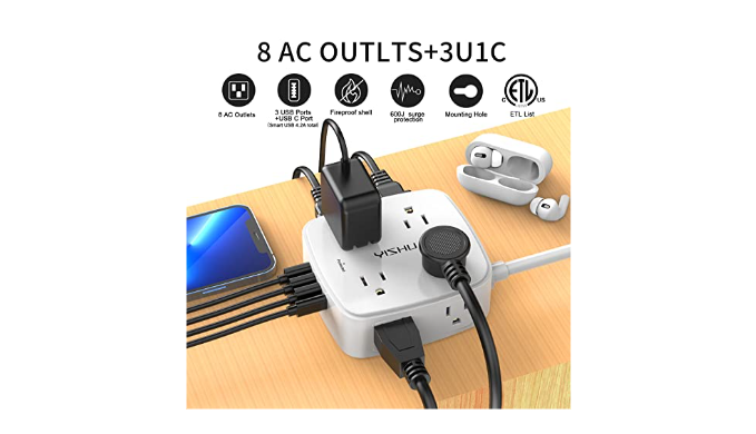 【Multi Safety Protection】- RoHS, FCC and ETL Certificates. This power strip has overload protection, short-circuit protection, over current protection, over-voltage protection and overheating protection. The surge protector with overload protection protects your electrical appliances from lighting, surges or spikes. The minimum energy-absorbing capacity of 600 Joules. It will automatically cut power to protect connected devices when voltage surge is overwhelming.