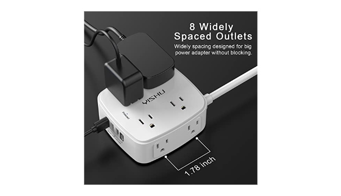 【Surge Protector Power Strip with 3 Side Design & Wide Space】- 3-side design that makes it easier to make the plugs not covering any outlet, and the 8 AC outlets with 1.8 inches long space in between, larger than standard 1.5-inch socket. Larger spacing makes it easier to use for all kinds of equipment.The compact design saves more space, suitable for the home, office, and college dorm room.