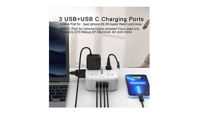 【4+4 Outlets Power Strip with 4 USB Ports】- The 3-side power strip with 8AC widely outlets and 4 USB charging ports total 4.2A, each USB A port features 5V/2.4A Max output. USB C charging port features 5V/3A MAX. can power up to 12 devices simultaneously.Wide range voltage design, can be used on 120v to 240v circuit
