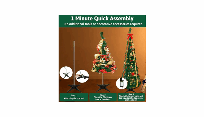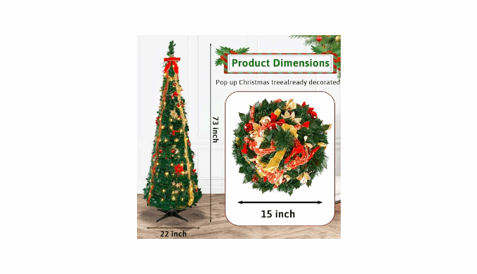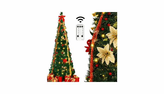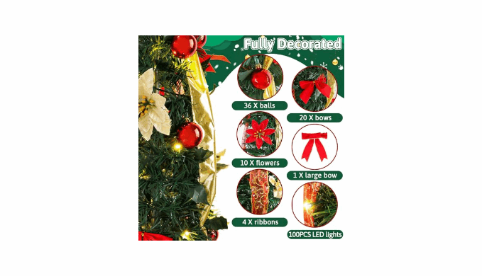 Pre-Decorated Pop Up Christmas Tree: Prelit christmas tree No need for extra decorations, this Christmas tree comes with a variety of beautiful decorations. Includes 36 Christmas balls, 20 bows, 1 large bow, 10 flowers, 4 ribbons and 150 LED lights. Everything except the balls and 1 large bow is pre-decorated. Decorate to your liking. No branches to attach or tools needed. Just release it, and your pop up Christmas tree is perfectly fluffed and ready to dazzle