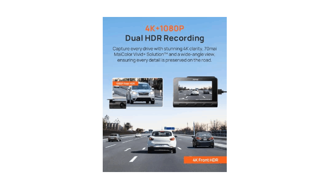 【True 4K Video Quality】Capture every detail in stunning clarity with the 70mai dash cam\'s true 4K video quality. Equipped with the latest IMX678 sensor and our exclusive MaiColor Vivid+ Solution (MVS), this dual dash cam ensures that your recordings are not only sharp and vibrant but also optimized for exposure balance, color accuracy, and stability. MVS technology enhances your footage in any environment, providing you with high-definition evidence that meets the demands of today’s drivers
