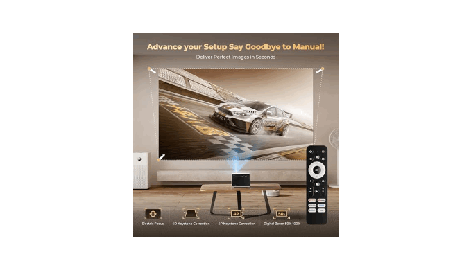 Easy to Setup , Electric Focus & 4D Keystone - Say goodbye to the tediousness and inaccuracy of manual focusing. Kogata Home Theater Projector have electric focus and 4D&4P keystone, the remote uses the latest infrared high-precision sensor, which can easily focus clear rectangle images by clicking the remote. Save valuable time and easily optimize image quality for an immersive viewing experience, whether you are watching a movie or playing a game. Additionally, the Proyector features 100% to 50% optical zoom, allowing projection size adjustments without physical movement. 1.25:1 short throw, 100-inch image from just 104inch/8.7ft from the wall.