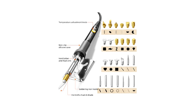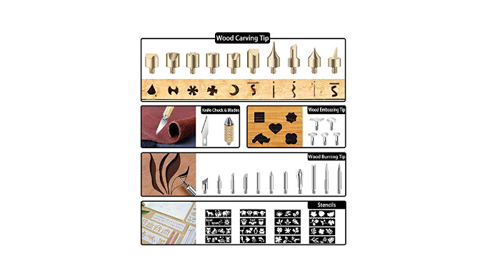 【Wood burner kit Checklist】woodburner kit - Soldering Iron x 1 · Soldering iron holder x 1 · assorted wood carving tips x 26 ·Conversion tip x 1 · Hot blade x 2 · mold x 16 · color pencil x 12 · Pencil sharpener x 1 · Carbon Paper x 15 · timber x 16 · Tip Storage Box x 1 · Exquisite storage pack x 1 · gloves x 2 · User Manual x 1