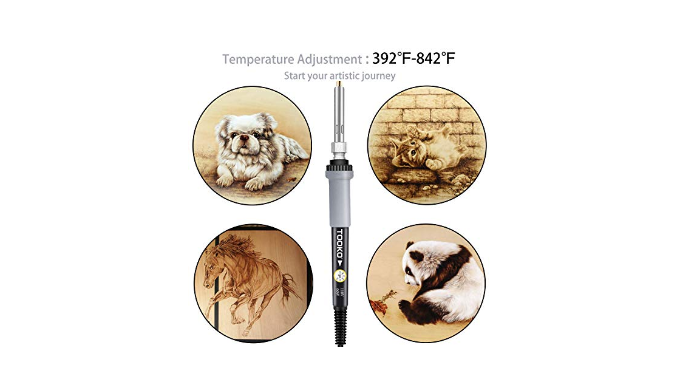【Wood burning tool】Rapid Temperature rise and temperature control,High quality 60W heated ceramic technology quickly heats wood burning kit in 30 seconds,it can be easily used for wood burning beginners, experienced and experts. Variable temperature and a temperature range from 200°C to 450°C allows you to control the heat of any project. Do not apply excessive pressure during use.