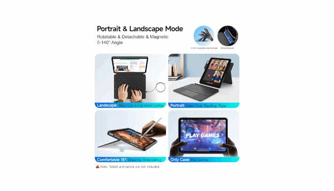 【360° Rotatable Kickstand For Landscape & Portrait Mode】Our accrosoo 360° rotating stand supports both landscape and portrait modes, with a 0-170° adjustable angle. Whether you\'re typing up a storm in landscape mode or enjoying a movie in portrait, this stand gives you the perfect viewing angle. Our accrosoo keyboard Case adapts to your every need.