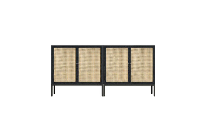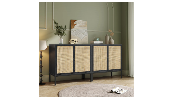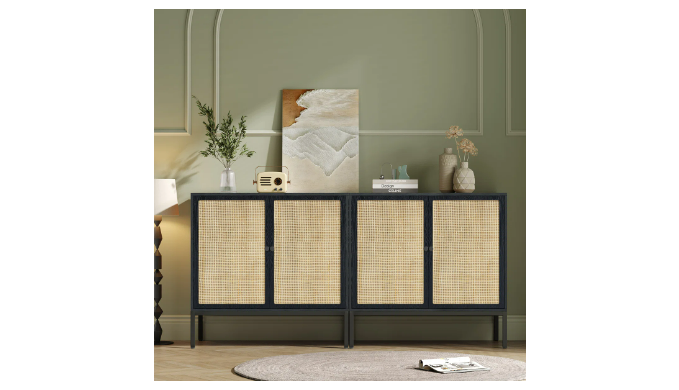 This 63” sideboard combines coastal charm with modern functionality, making it a versatile addition to your dining room or living space. Crafted from engineered wood and metal, it features four doors adorned with natural rattan, adding texture and breezy style. Inside, two shelves provide ample storage for dinnerware, linens, or electronics. The black metal accents and hardware offer a contemporary contrast to the warm tones of the rattan. Plus, it’s scratch- and water-resistant, so it stands up to everyday use.