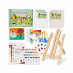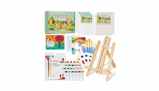 Complete paint set for kids : This 43-piece set includes everything young artists need: 6 Canvas Panels (3 patterned, 3 blank), 24 color vibrant acrylic paints (12ML each), 10 brushes in various sizes, paint palettes,15 sheet Paper pad and table easels. Whether you’re looking for painting kits for kids ages 4-8 or art supplies for kids 9-12, this set has it all!