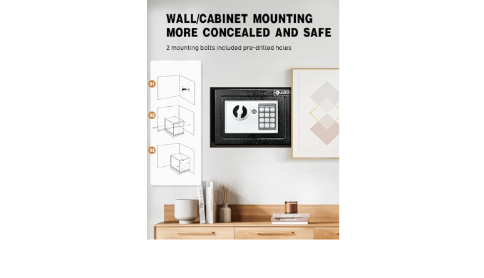 【Multi-scene Use】The digital electronic password safe with two bolts, package contains screws for fixing use, you can fix the hidden safe box on walls, floors, or cabinets, and also be used as a portable money box. Suitable for home, office, hotel, and other places as a storage device like a wall safe to protect your valuables.