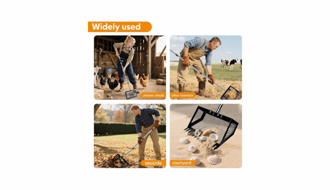 【ADJUSTABLE STAINLESS STEEL CONSTRUCTION】Built with rust-proof stainless steel, this chicken scooper for poop features a 5-position adjustable handle (22\"-75\") to perfectly suit users of all heights and coop sizes. From navigating tight corners in small coops to reaching across wide pens, this metal chicken poop scooper ensures durable, long-lasting performance everywhere.