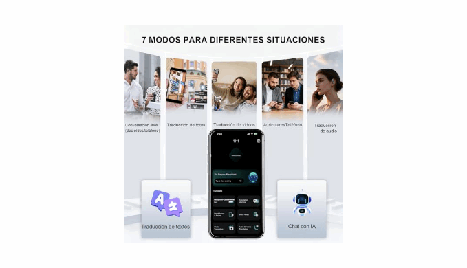 【7 Translation Modes Integrated with AI】Audifonos traductores inglés español Master any scenario with seven specialized modes: Free Talk, Text, Photo, AI Chat (with ChatGPT), Call, Video translation, and Headphone mode. Translate menus, conduct video conferences, or learn a language with AI—all with one versatile ai real time translation earbuds. Experience unparalleled practicality and convenience anywhere