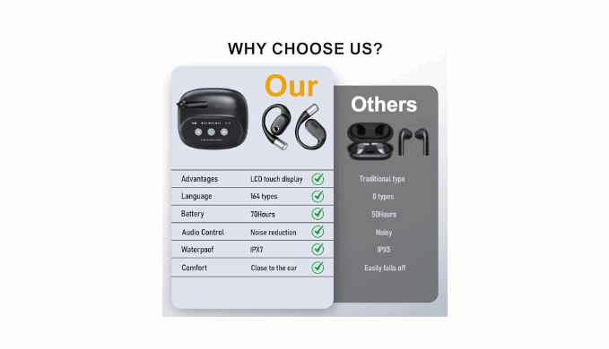【70-Hour Total Battery Life Goodbye to Frequent Charging】Wireless earbuds powered by a large 600mAh charging case,translation headphones deliver an exceptional 70 hours of total usage time. Ideal for long-haul flights and multi-day business、trips、meeting and learning, translator earbuds real time marathon battery life ensures your translator and earbuds perform flawlessly without constant recharging