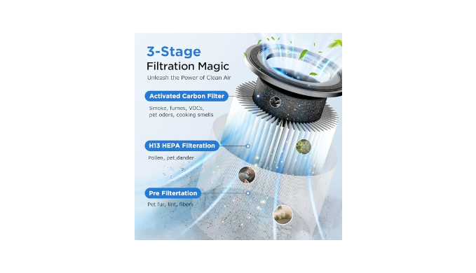 3-Layer Filtration System: The air purifier\'s three-layer filtration effectively filters airborne particles as small as 0.3 microns, ensuring the utmost purity of your indoor air. Plus, Our filter change reminder simplifies maintenance, alerting you when it\'s time to replace the filters, keeping your air purifier working at its best.