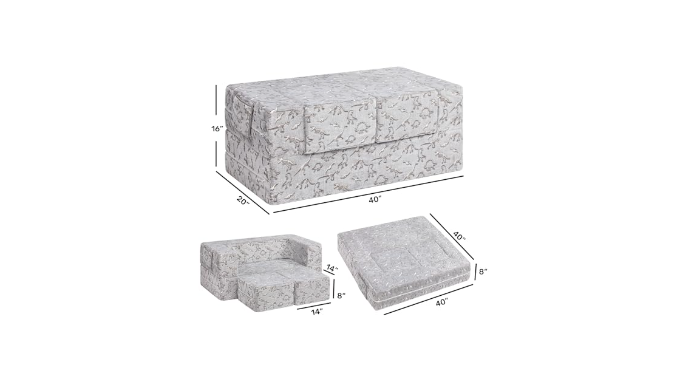 SIZE: Sofa: 40\"L x 20\"W x 16\"H ; Flipped Out Into Play Mat: 40”L x 40”W x 8”H ; Ottomans: 14”L x 14”W x 8”H. Recommended for ages 18 months + ; Holds up to 200 lbs.